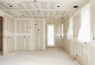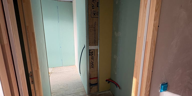 Cloisons, doublages, plafonds et aménagements intérieurs réalisés dans le respect de l’existant et des contraintes du logement. Organisation des volumes, intégration des réseaux et finitions prêtes à peindre.